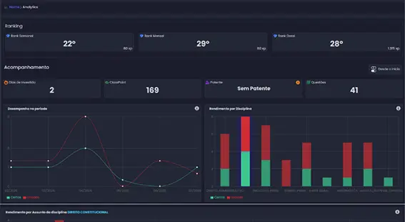 Com nosso painel de gamificação, você acompanha o seu desempenho por disciplina, acertos e erros, evolução semanal e até conquistas por mérito — e você enxerga isso em tempo real.